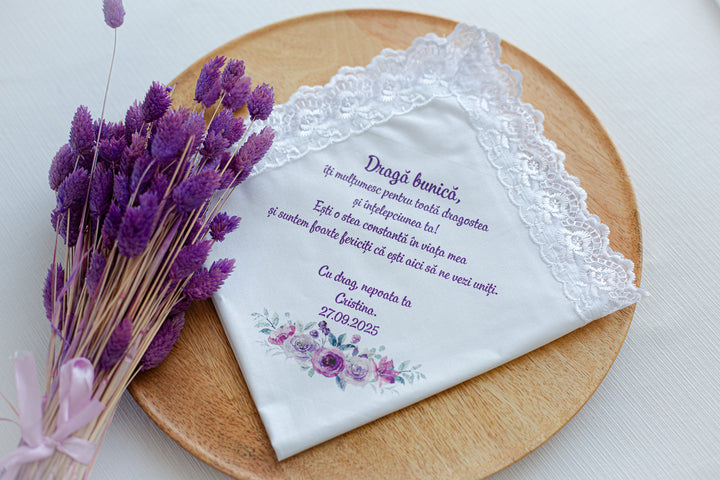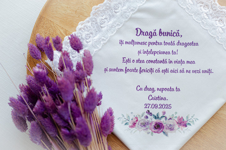 Surprinde-ti bunica cu un cadou simbolic si profund emotionant: o batista personalizata cu un mesaj din suflet, special conceput pentru ziua nuntii. Aceasta batista delicata este modul ideal de a-i arata recunostinta si dragostea pentru toti anii in care ti-a fost alaturi.
