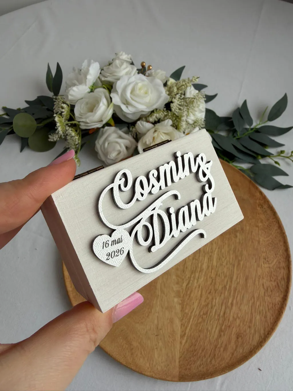Când emoțiile ating apogeul și momentul schimbului de verighete se apropie, fiecare detaliu contează. Această cutie de verighete personalizată, realizată din materiale premium precum lemn sau forex, este mai mult decât un simplu accesoriu – este o amintire de neuitat. Cu un design elegant și simplist, cutia protejează simbolurile iubirii voastre într-un mod unic și rafinat.