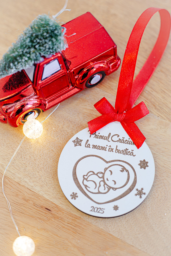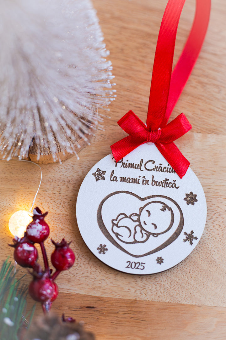 🎄 Glob din lemn gravat – „Primul Craciun la mami in burtica”