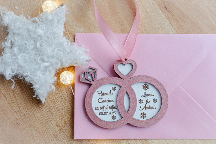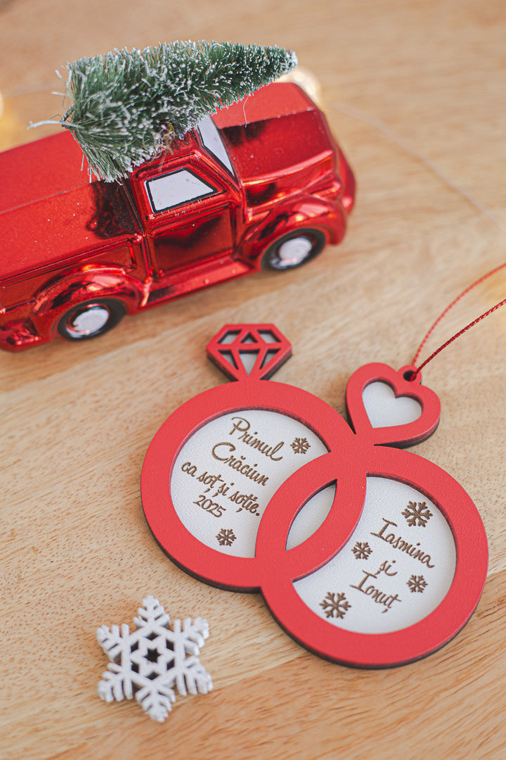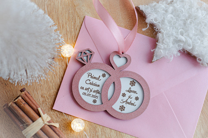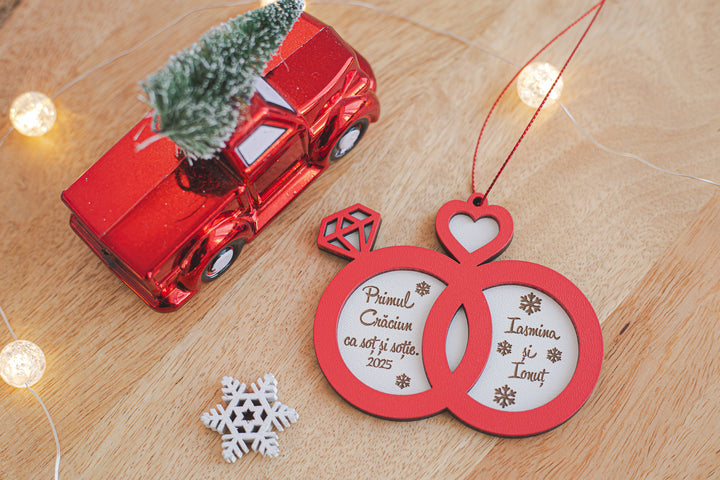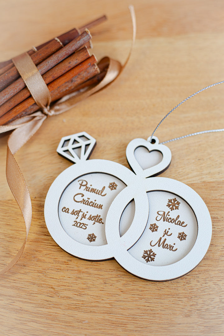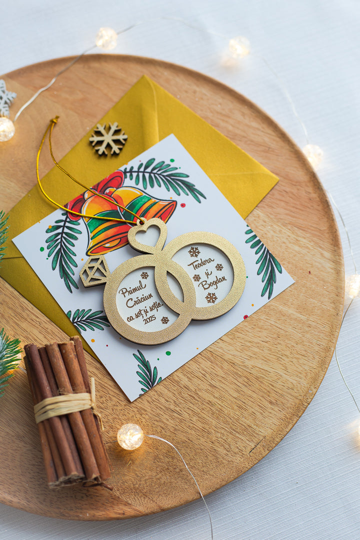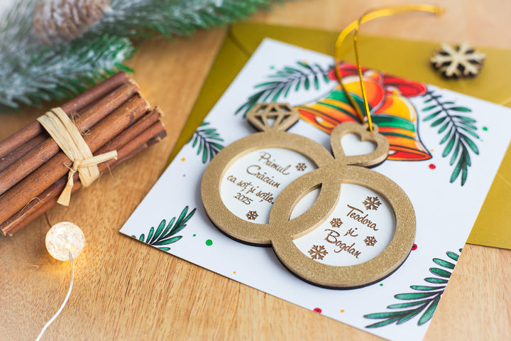 💍 Glob personalizat din lemn – „Primul Craciun ca sot si sotie” in forma de verighete