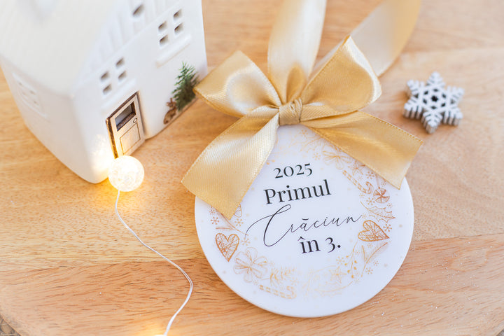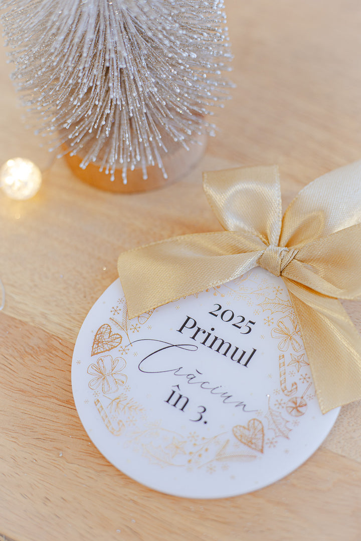 Un decor special pentru un moment unic! Acest glob din plexiglas alb este personalizat cu un design elegant auriu si textul "Primul Craciun in 3", perfect pentru a marca prima sarbatoare in formula completa de familie.