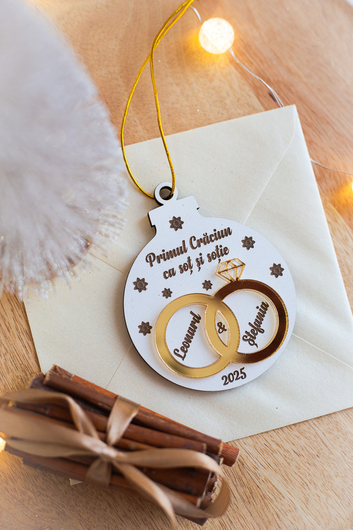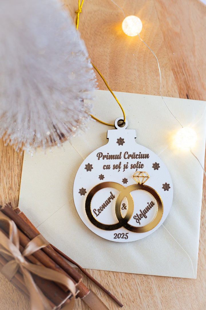 🎄Glob rotund personalizat – „Primul Craciun ca sot si sotie” cu verighete aplicate