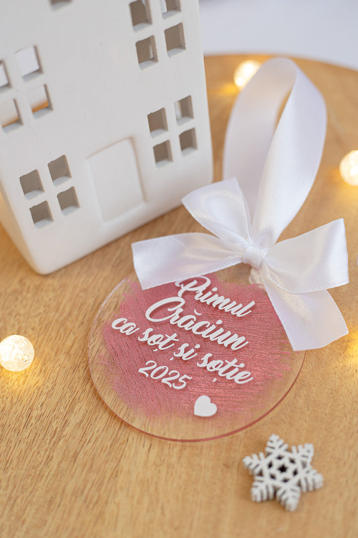 Un glob elegant si simbolic, realizat din plexiglass transparent, perfect pentru a marca primul Craciun in calitate de sot si sotie. Personalizat cu text ales de voi, acest glob devine o amintire pretioasa a unui moment unic din viata. Fundalul este vopsit manual in culoarea preferata, oferind un plus de rafinament si emotie bradului de Craciun.