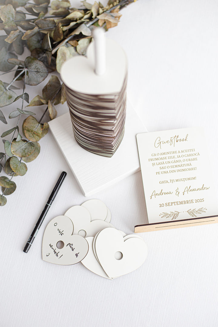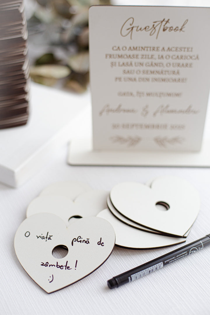 Pentru că fiecare mesaj contează, iar acest guestbook din lemn cu inimi personalizabile este realizat cu pasiune și atenție la detalii, transformându-se într-o amintire prețioasă a nunții tale.
