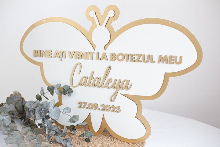 Panou personalizat în formă de fluture, ideal pentru decorul de botez.