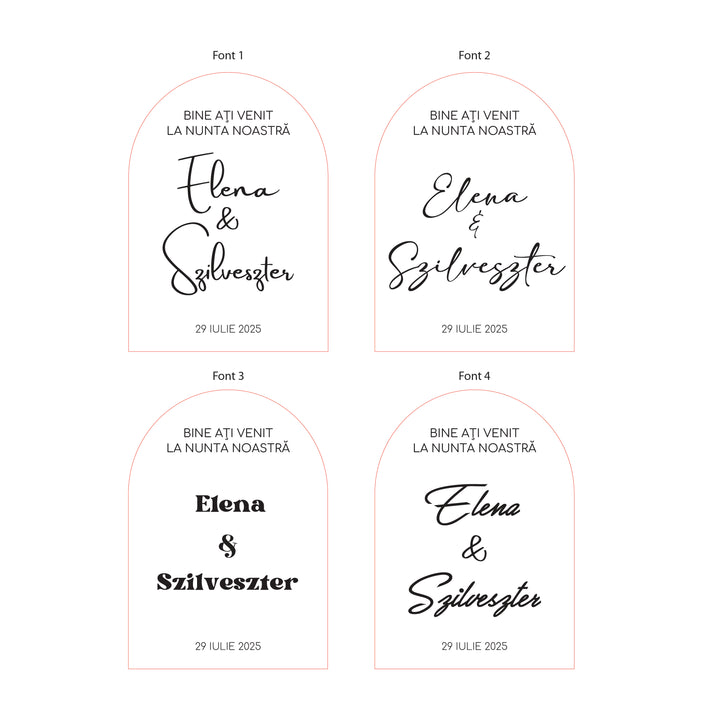 Personalizare completă – numele mirilor, data nunții și un mesaj de întâmpinare unic.