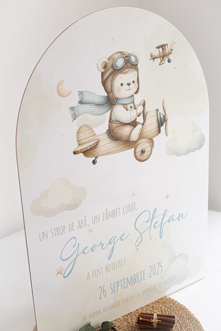 Transformă întâmpinarea invitaților într-un moment memorabil cu această plăcuță decorativă, perfectă pentru evenimentele speciale precum botezul. Realizată din materiale premium și cu un design personalizabil, plăcuța se integrează armonios în decorul tematic, adăugând o notă caldă și elegantă încă de la intrare.