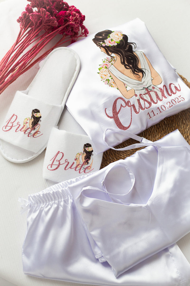 Pregătirile din dimineața nunții devin mai speciale cu acest set complet dedicat miresei, compus din halat din satin, pijamale (maieu + pantaloni scurți) și șlapi personalizați. Fiecare piesă este realizată din materiale fine, oferind un plus de confort și stil în cele mai emoționante momente dinaintea marelui „DA”.