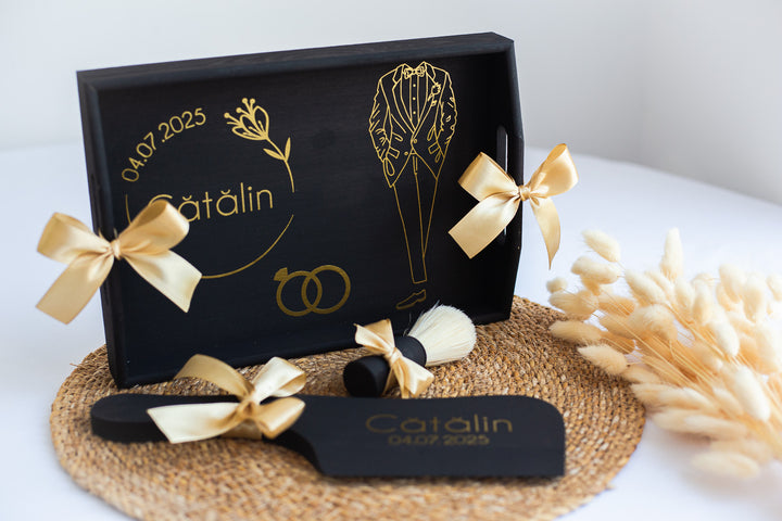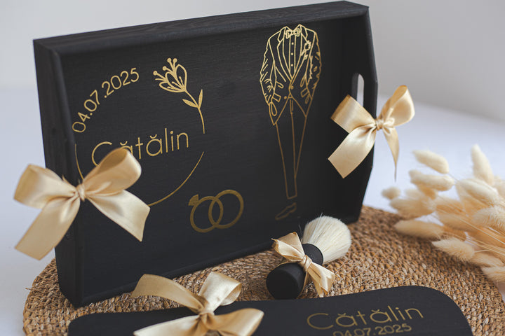 Înainte ca mirele să-și înceapă drumul alături de aleasa inimii sale, tradiția spune că trebuie să treacă prin ritualul gătitului mirelui, un moment plin de voie bună și semnificație. Acest set personalizat pentru gătitul mirelui conține toate accesoriile esențiale pentru această tradiție specială, fiind personalizat cu nume, mesaje speciale și data evenimentului, pentru a se potrivi perfect stilului și tematicii nunții voastr